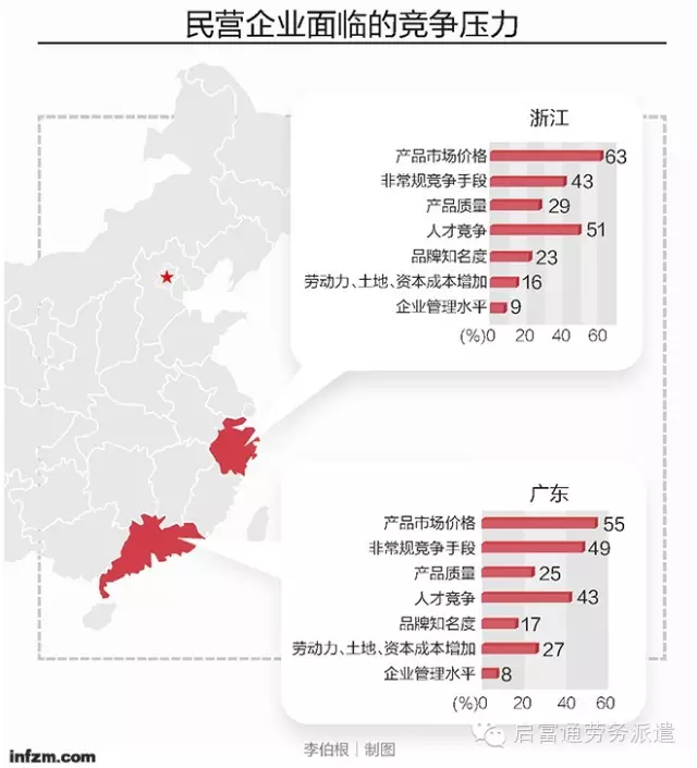 课题组问及了企业自身所面临的主要竞争压力(可多选)。根据选择频次来看,广东和浙江两省企业家都认为面临的主要压力均来自价格竞争(广东55%,浙江63%)、非常规竞争(广东49%,浙江43%)和人才竞争(广东43%、浙江51%)。其次是劳动力、土地等成本的上升(广东27%、浙江16%),产品质量(广东25%、浙江29%),最后是品牌知名度(广东17%,浙江23%)和企业管理水平(广东8%,浙江9%)。